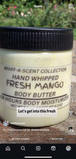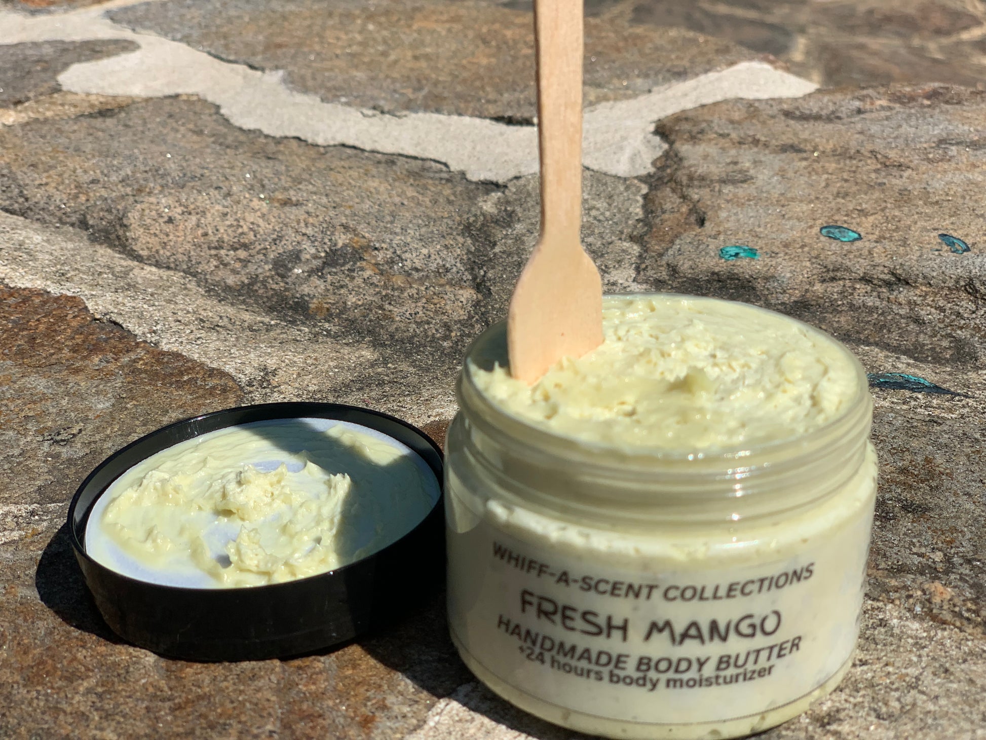 Smelling like a fresh tropical mango, this body butter will be on your favorites list. Made with only the best unrefined natural Ingredients of Shea butter, mango butter, avocado butter, coconut oil, grape seed oil, Neem oil, vitamin e, kelp and turmeric. This body butter will even skin tone, help with eczema, even radiation burns and much, much more. Body butter is best used on damp skin to lock in all day moisture.