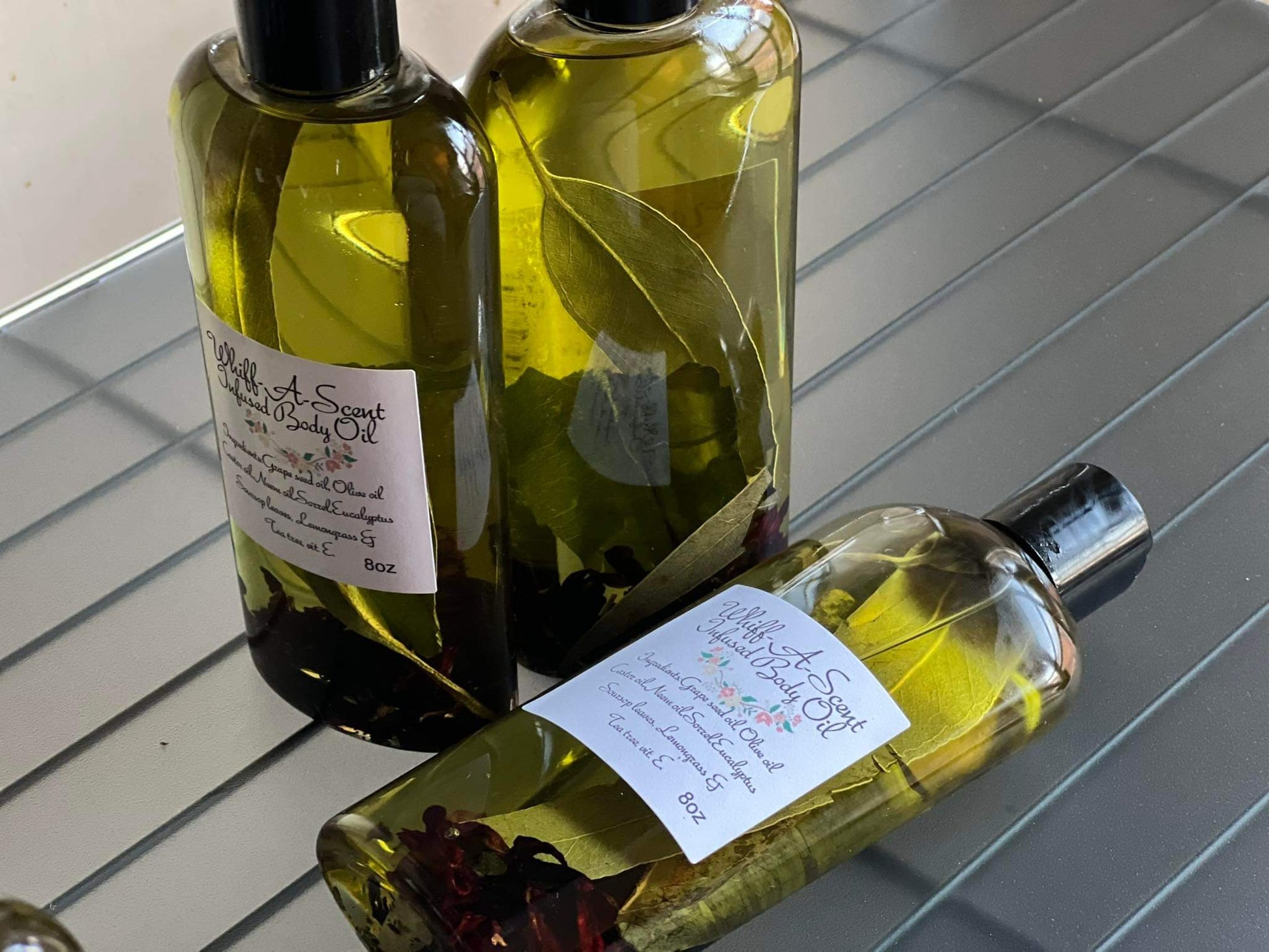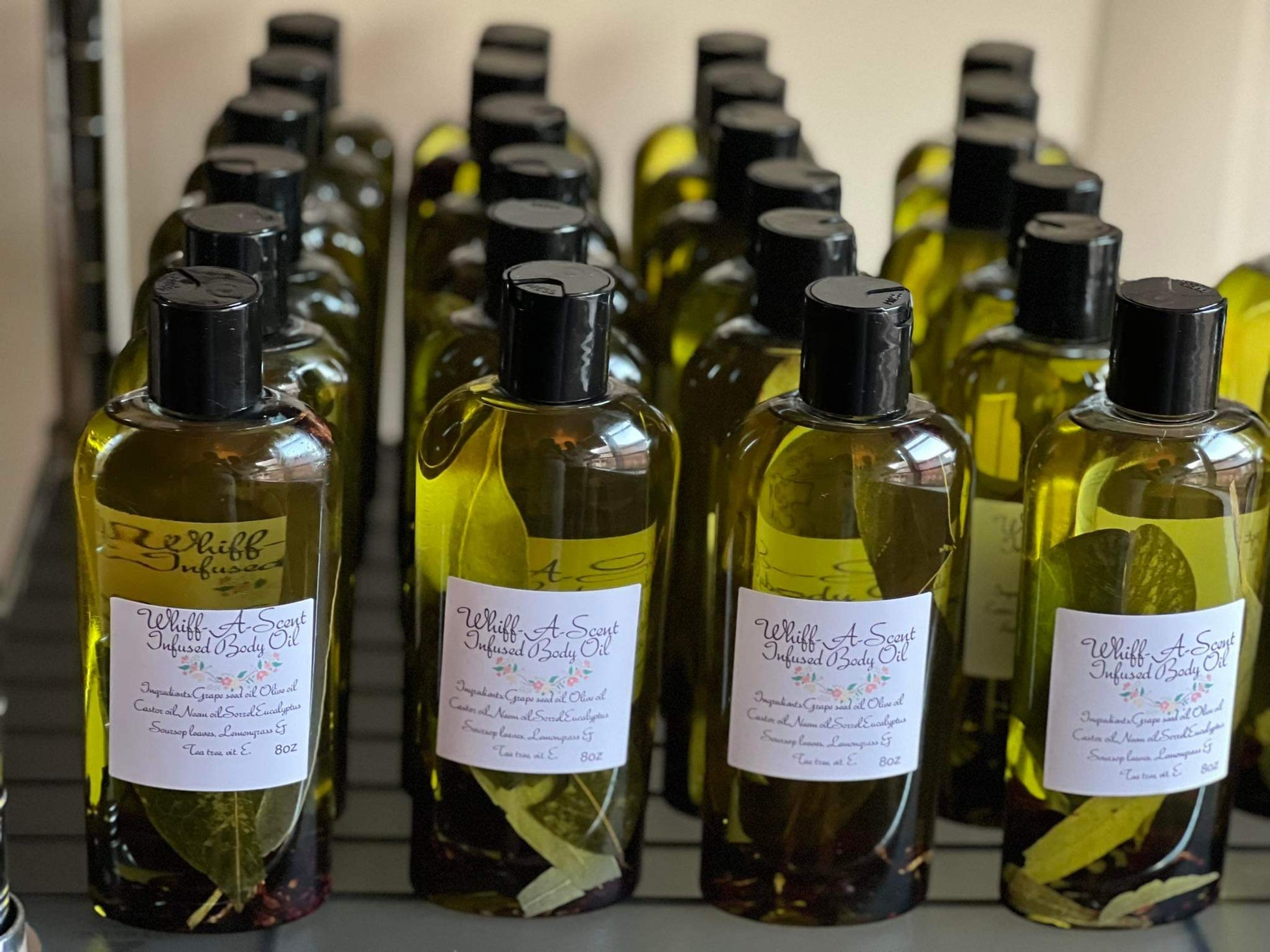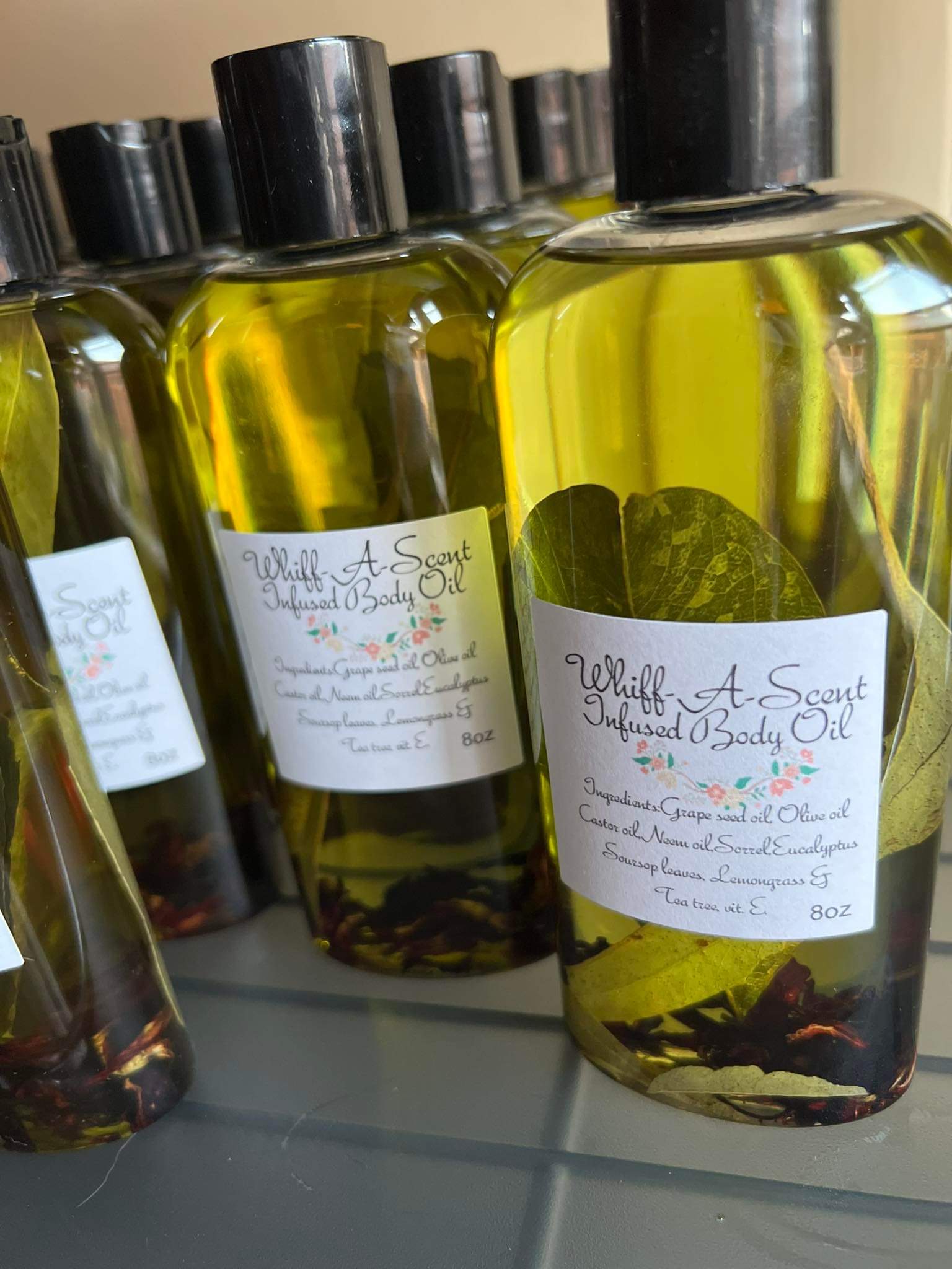 Made with grape-seed oil, olive oil, castor oil, neem oil, sorrel( hibiscus flower), eucalyptus leaves, sour-sop leaves, lemongrass and tea tree essential oils, vitamin e oil. 100% Infused with nature to give your skin the best benefits possible. After shower or bath apply infused Body oil to skin while still damp to lock in moisture. Use as a natural repellent from mosquitoes bites, ingrown hairs, and used with the charcoal and turmeric soap for eczema and psoriasis. Great moisturizer, smells amazing and can be used from hair to toe including face.